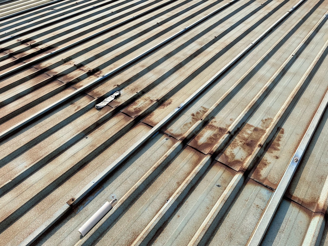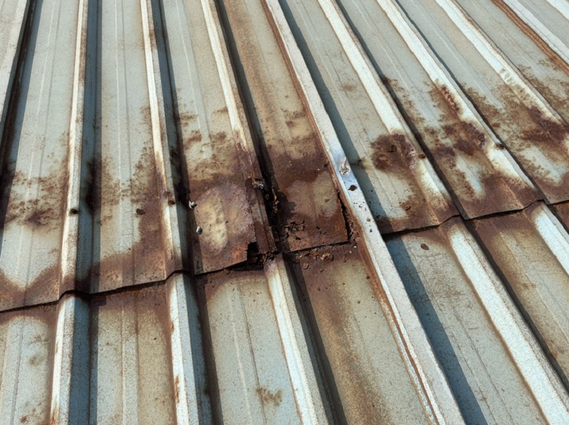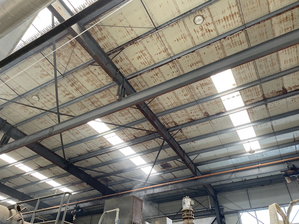 我公司2021年9月施工的位于重慶市潼南區(qū)田家工業(yè)園的重慶遠達催化劑綜合利用有限公司彩鋼頂防水,此廠房內為生產(chǎn)催化的車間,氣體具有一定的腐蝕性,導致廠房的彩鋼頂出現(xiàn)了一些銹蝕,彩鋼頂銹蝕情況: