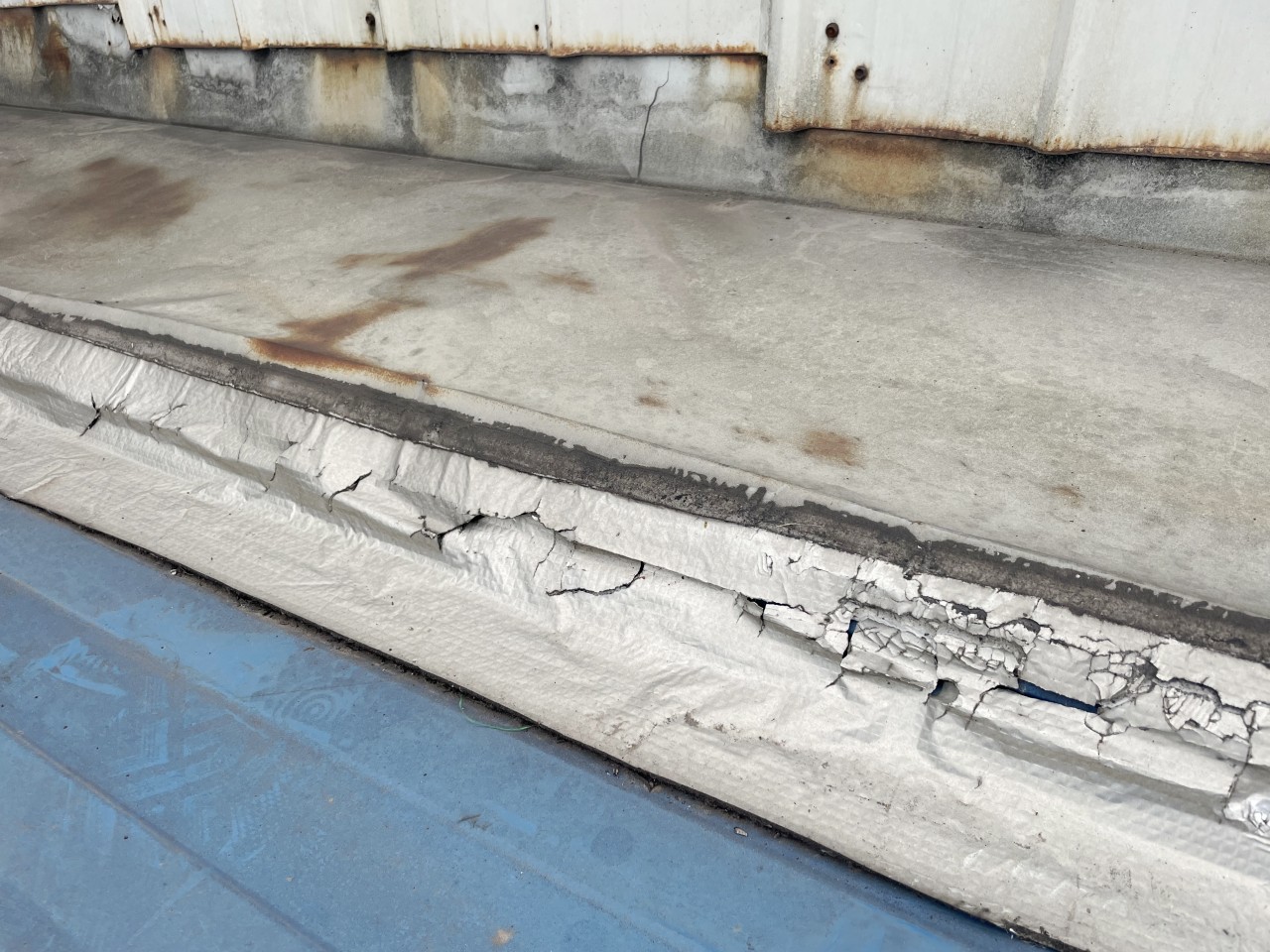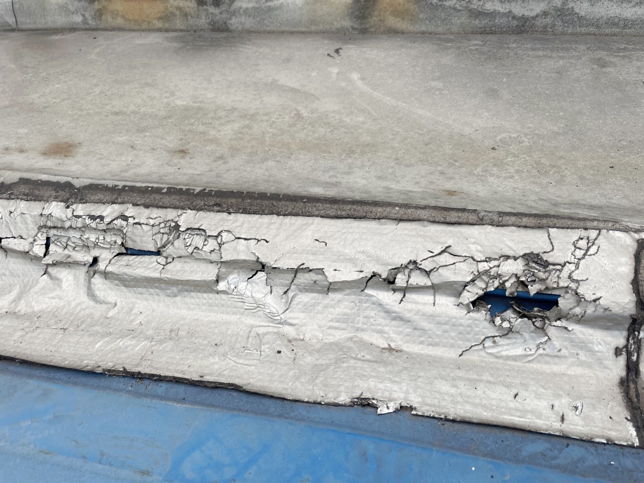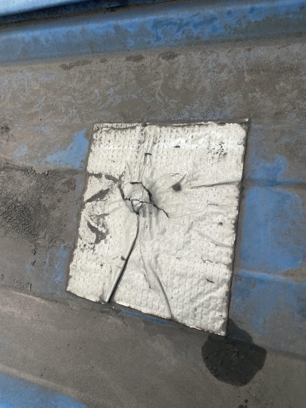 下面這照片中就是之前其他公司采用丁基膠帶修補(bǔ)的,丁基膠帶已經(jīng)開(kāi)裂了,沒(méi)有起作用了。