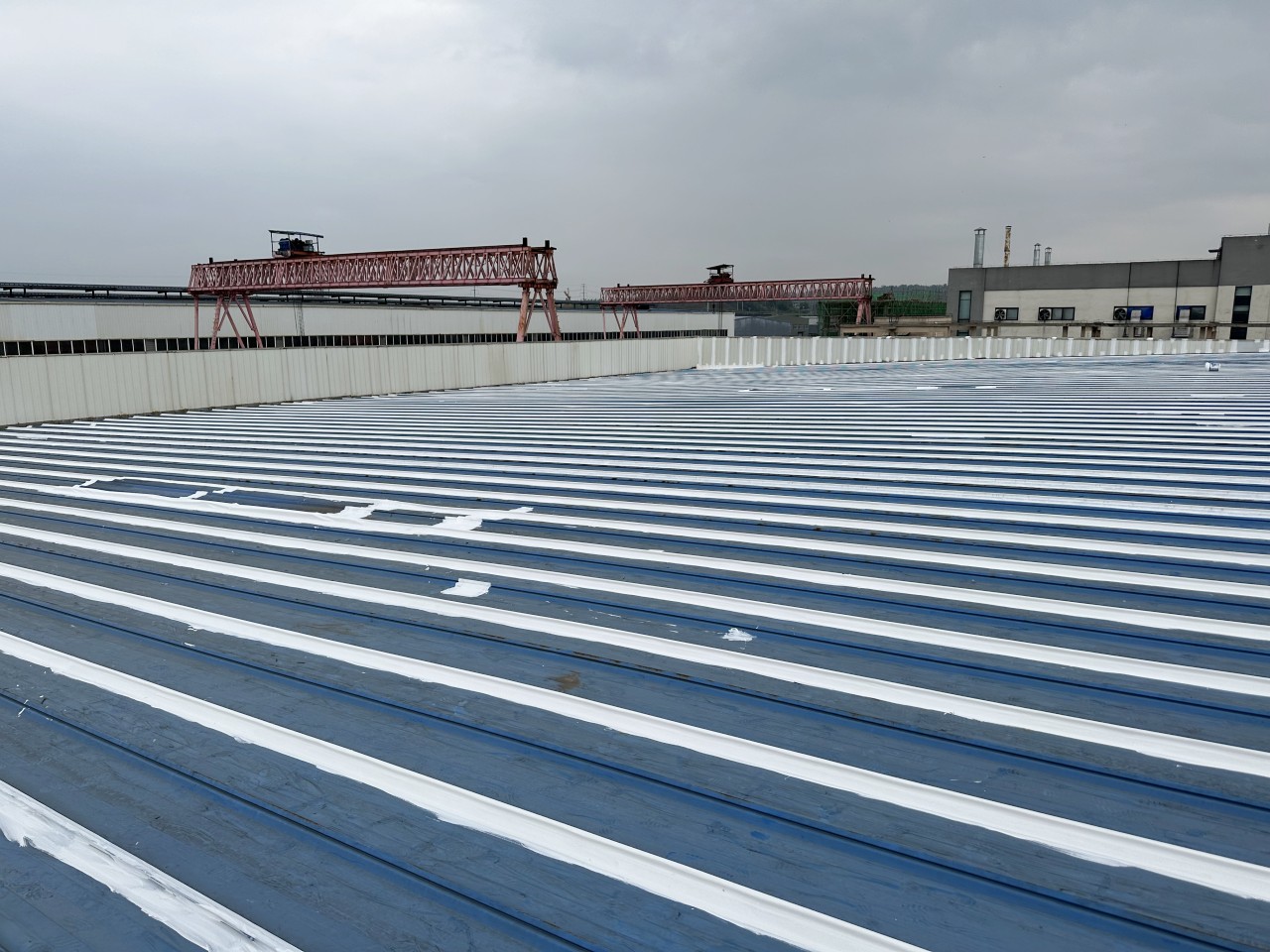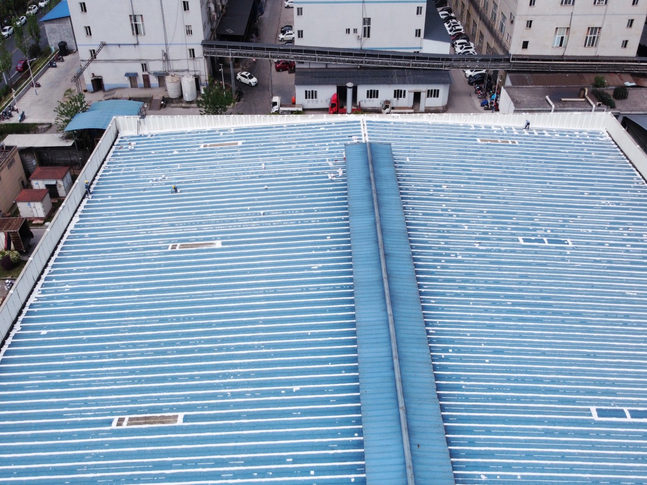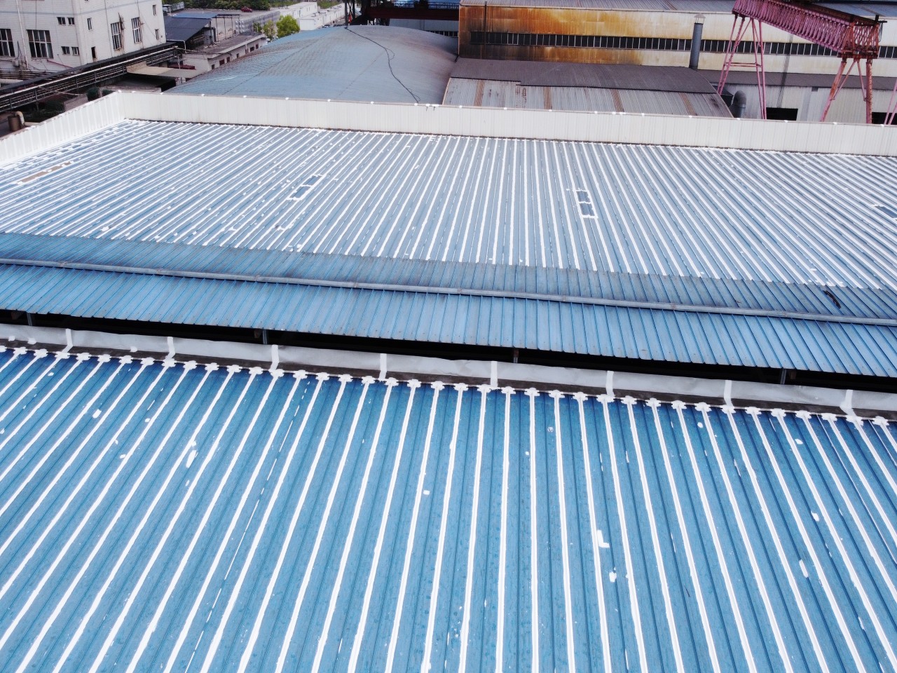 此位于重慶市榮昌區(qū)榮升路103號(hào)的鋼結(jié)構(gòu)廠(chǎng)房是已經(jīng)修建好了近十年了,最近一兩年逐漸出現(xiàn)了彩鋼頂漏雨的情況,開(kāi)始的時(shí)候漏水點(diǎn)還不是很多,逐漸的漏水點(diǎn)越來(lái)越多,影響到了廠(chǎng)房?jī)?nèi)部的生產(chǎn)活動(dòng),業(yè)主方開(kāi)始也找其他公司進(jìn)行過(guò)一些修補(bǔ)施工,但是效果不是很理想,之前的施工方采用的是丁基膠帶進(jìn)行粘貼密封修補(bǔ)的,但是沒(méi)有過(guò)多久,那丁基膠帶就開(kāi)裂了,又漏雨了,客戶(hù)找到我們公司,我們公司根據(jù)現(xiàn)場(chǎng)查勘之后,定制了適合現(xiàn)場(chǎng)實(shí)際的施工方案,采用SYR金屬屋面防水涂料配合縫織聚酯布針對(duì)彩鋼頂?shù)牟输摯罱涌p、中間固定螺釘、彩鋼板的一些破損孔洞部位進(jìn)行一布三涂的方式進(jìn)行防水補(bǔ)漏施工,客戶(hù)看了施工方案之后比較滿(mǎn)意,然后又考察了采用SYR金屬屋面防水涂料施工的其他地方的工地之后,最終確定由我公司對(duì)此彩鋼頂進(jìn)行全面的防水補(bǔ)漏處理。
