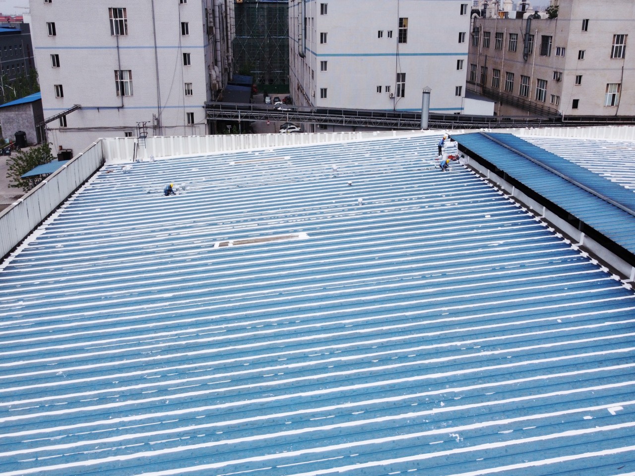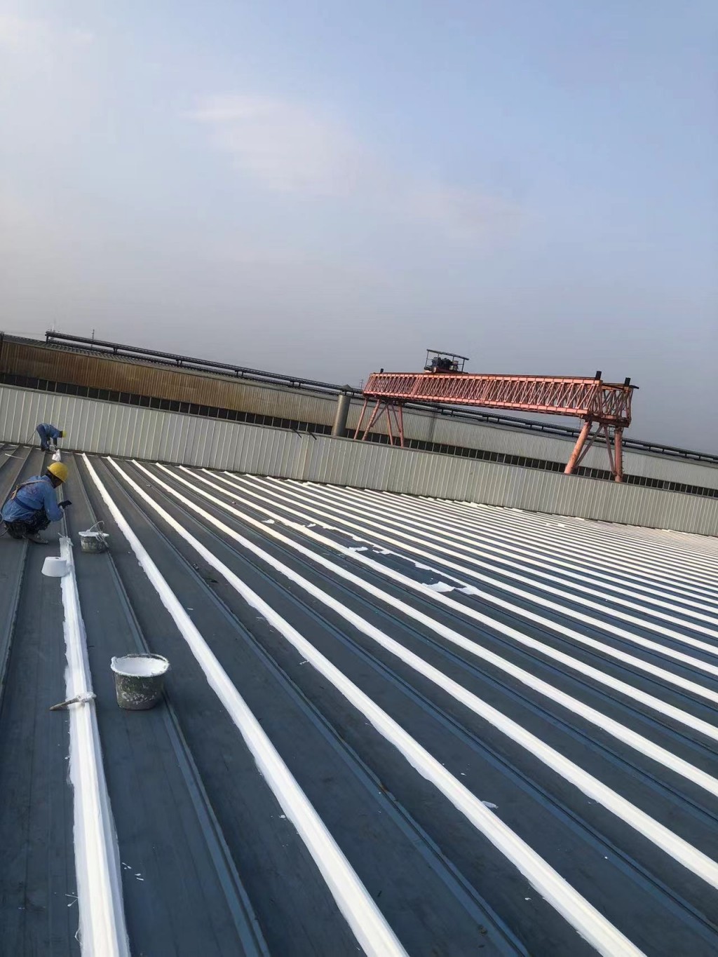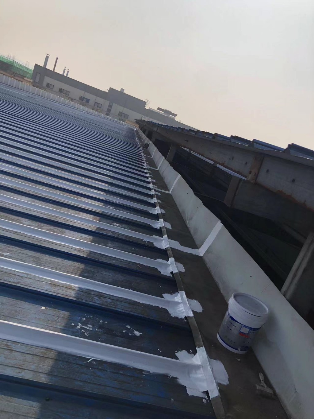 下面這些照片中就是我們公司現(xiàn)在施工的現(xiàn)場(chǎng),彩鋼板中間有破損孔洞的部位也是采用一布三涂的方式進(jìn)行防水密封處理了的,這樣處理了之后彩鋼頂形成了一個(gè)完整體,表面的水就不再漏到樓下室內(nèi)了。處理了之后下雨觀(guān)測(cè)效果很好。
