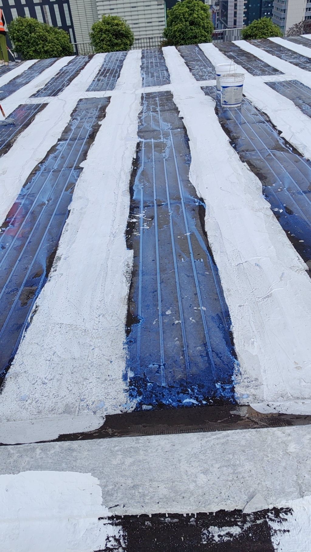 接下來,公司采用了SYR金屬屋面專用防水涂料配合專用縫織聚酯布進行防水密封處理。針對彩鋼拼接縫和固定螺釘部位這些容易漏水的關鍵區域,技術團隊采用了一布三涂的方式,確保防水涂料能夠充分滲透并緊密貼合彩鋼表面,形成一層堅固的防水屏障。同時,縫織聚酯布的加入增強了防水層的韌性和耐久性,有效防止了因材料老化或外力作用導致的開裂和破損。